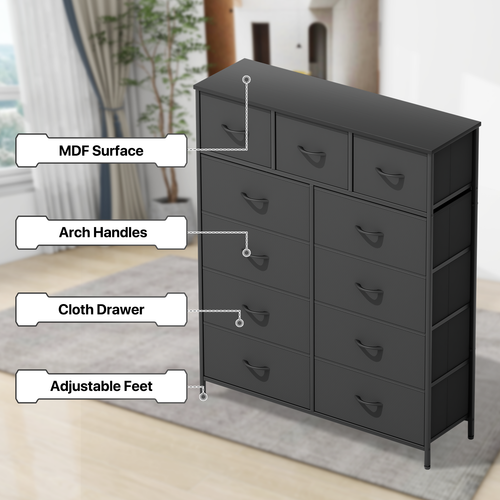 ✨ What is it - Discover our elegant 11-drawer black fabric chest of drawers designed for all your storage needs! Perfect for bedrooms, living rooms, or playrooms, this tall dresser combines sophistication with functionality. With a sturdy metal frame and breathable fabric drawers, this dresser is both stylish and practical.