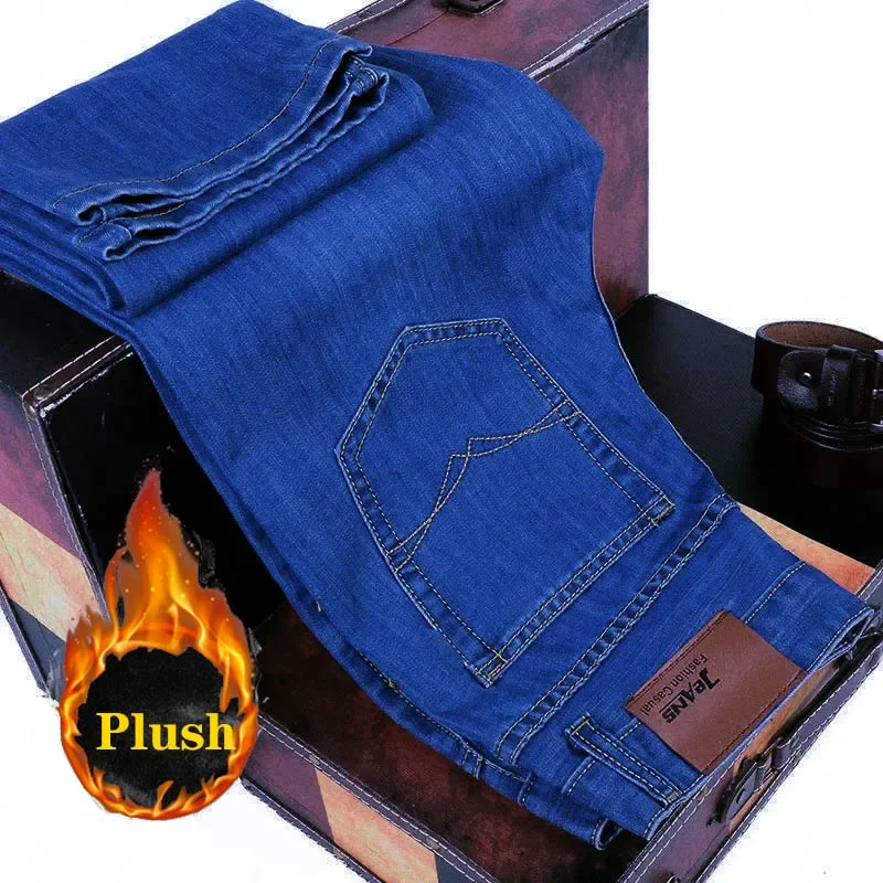 2025 New Business Casual Trousers Grey Fleece Men Clothes Black Blue Elasticity Warm Winter Jeans Velvet Jeans 28-40