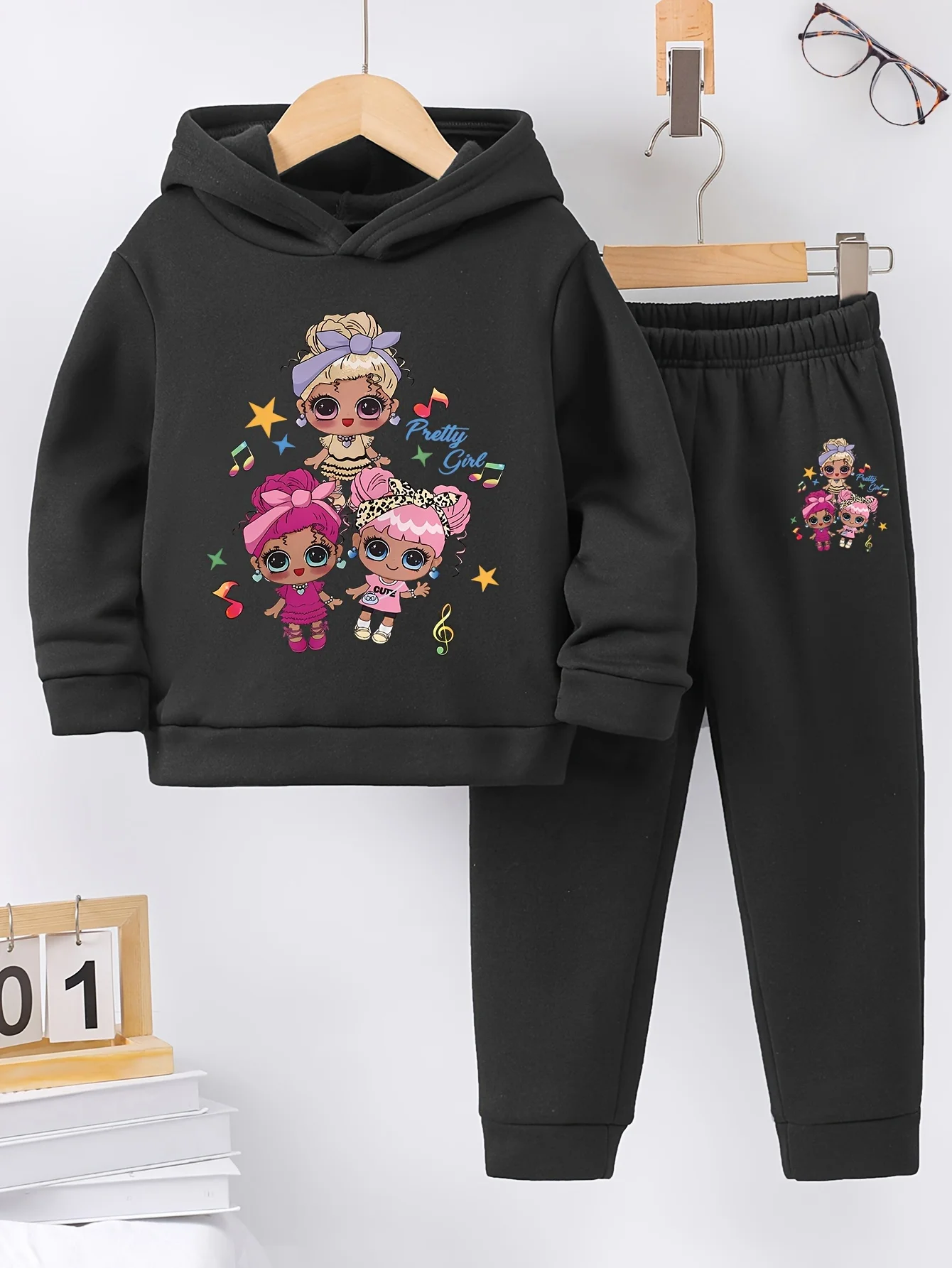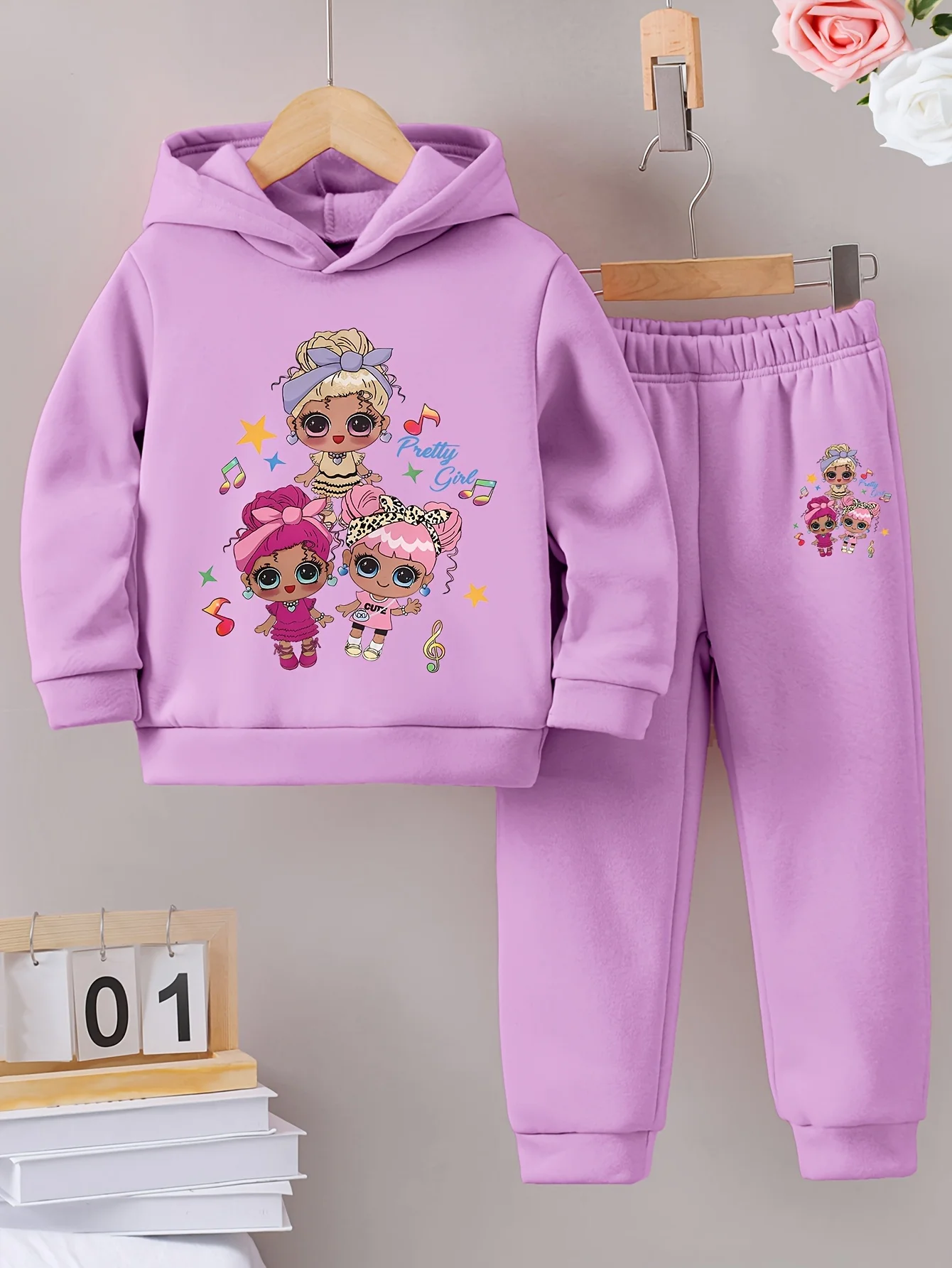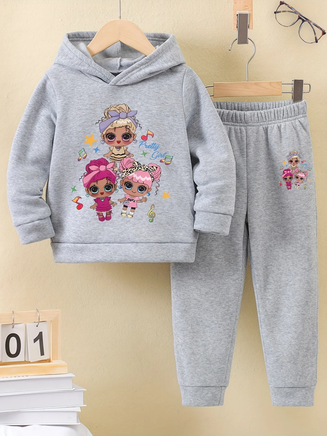 2set Autumn and winter new casual comfort sports style warm girls printed warm lining hoodie and tracksuit pants