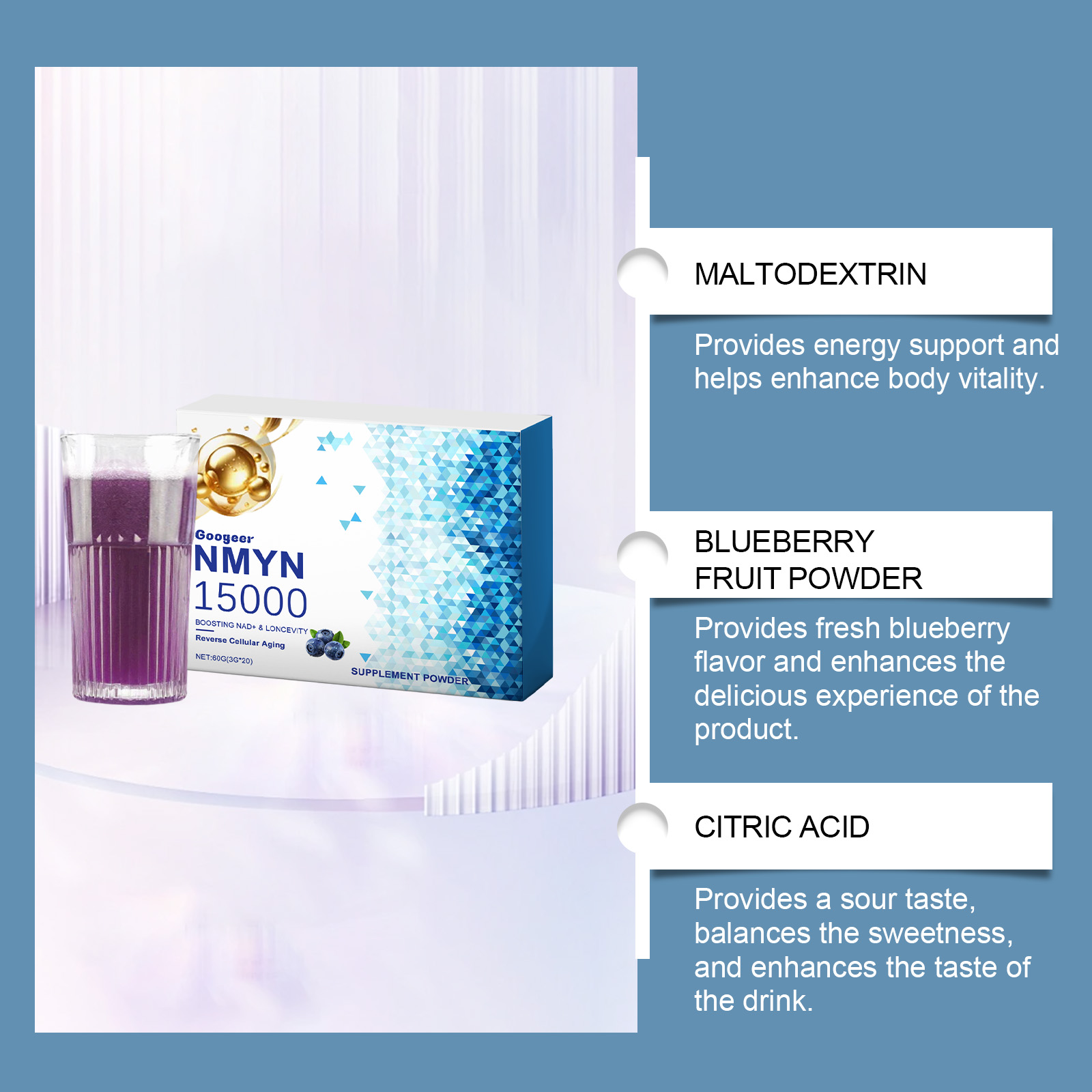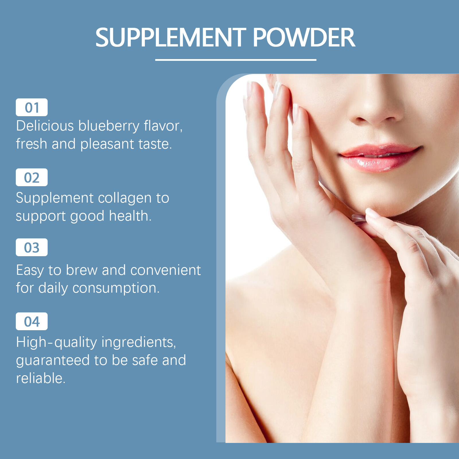 Our supplement powder contains maltodextrin, glucose and blueberry powder. It can provide energy support and help increase physical vitality. Provide fresh blueberry flavor to enhance the delicious experience of the product. Its use method is very simple: 1. Put the product into the container; 2. Add hot water above 80℃; 3. Mix well from the inside out. The addition of blueberry powder brings fresh fruit taste and enriches the taste experience. Contains collagen peptides to help replenish the body's needs and maintain vitality.