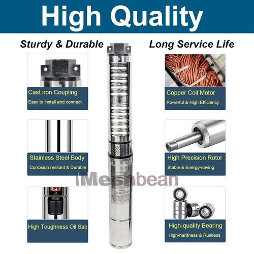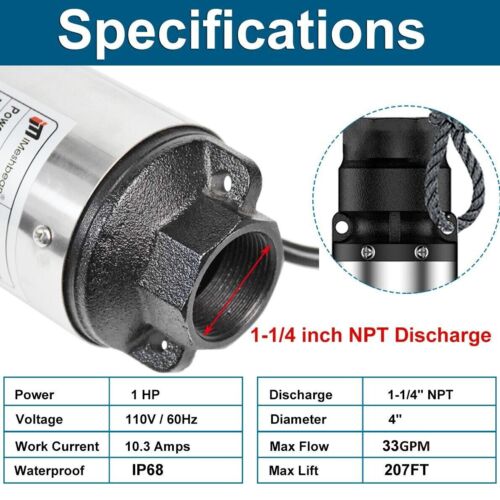 1 HP Deep Well Submersible Pump, 4" , 115V, 33 GPM, 207 ft ,Stainless Steel US