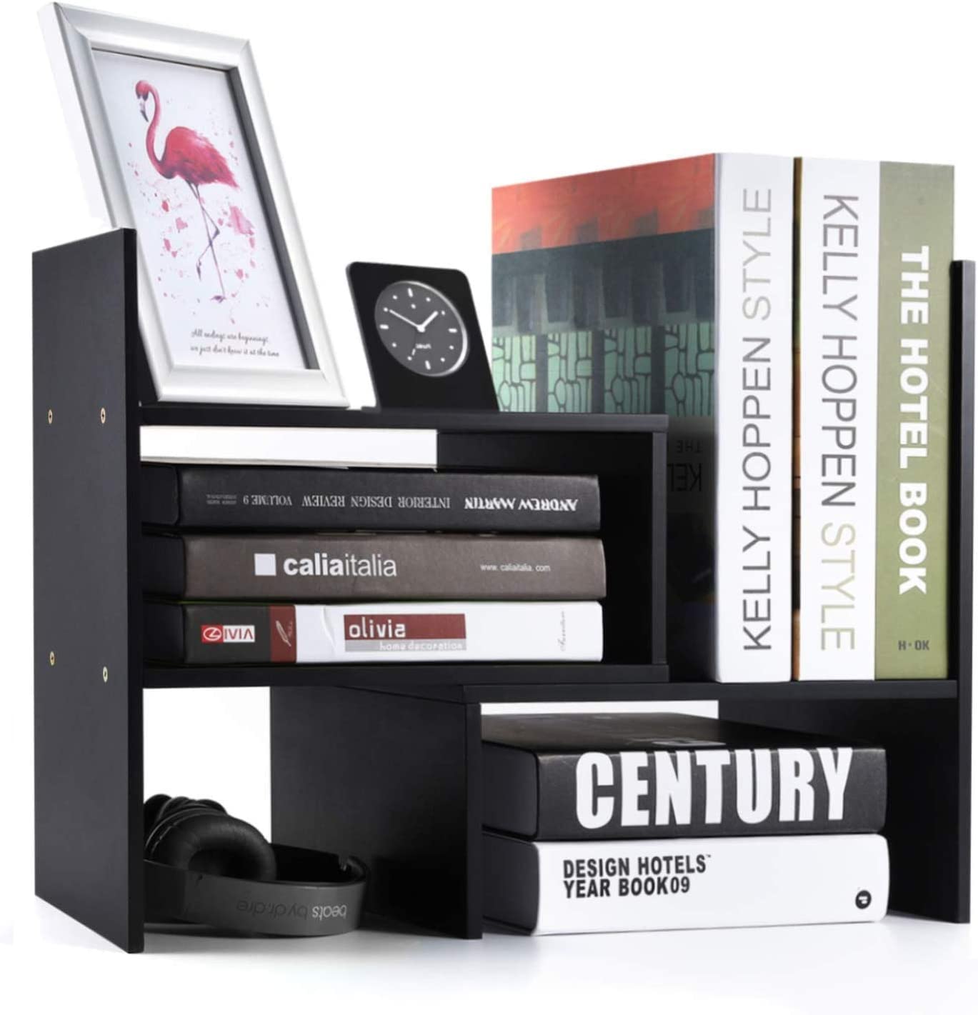 • EASY TO ASSEMBLE: Wood desktop bookshelf is easy and simple for you to install on your own. Screws and double head(Slotted/Phillips) screwdriver are included. Dimensions (inches): L12.3(can extends to 24.01) X W6.7 X 13.8H.