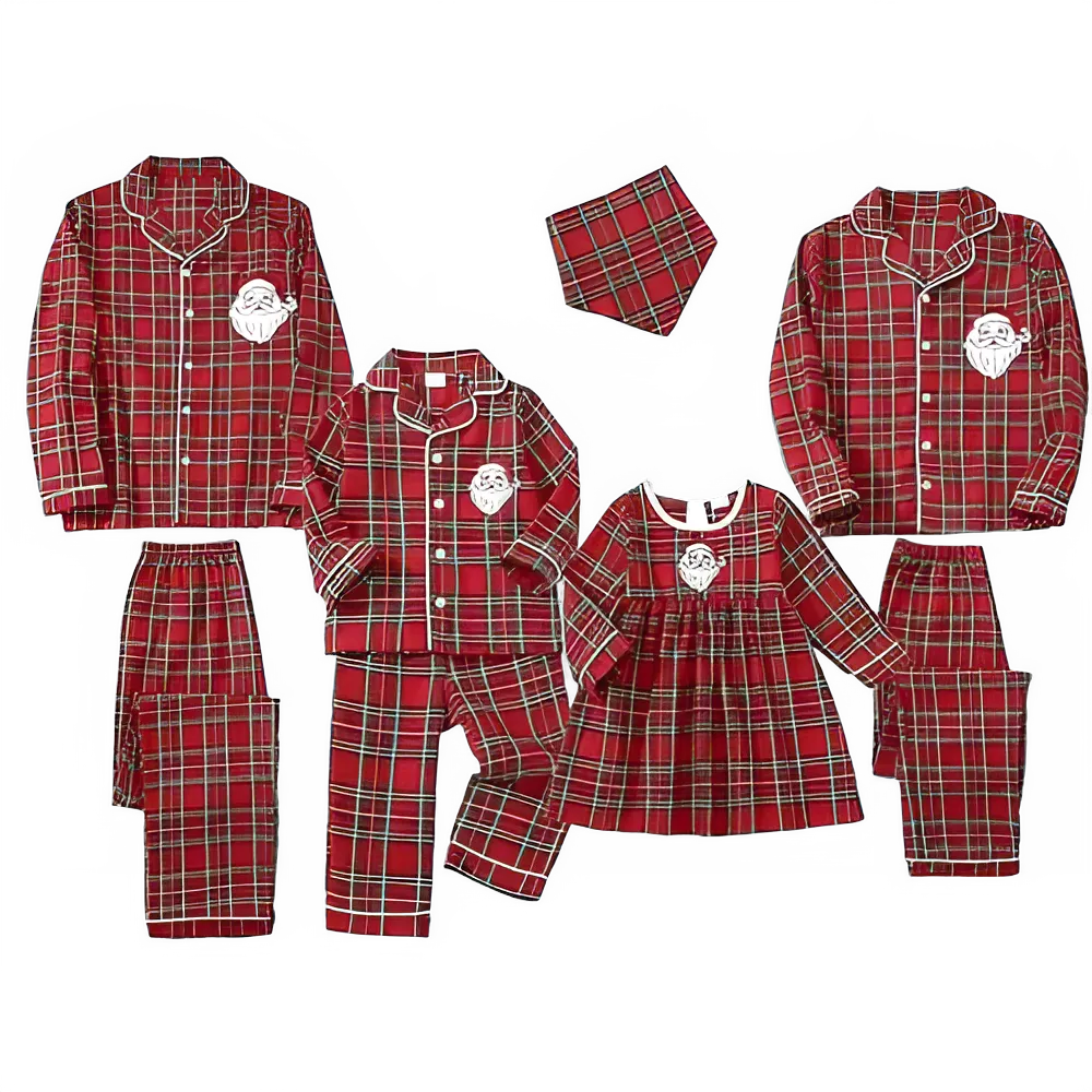 - Stylish red plaid pattern with fun Santa Claus embroidery adds festive charm.