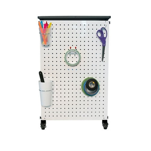 Highlights include a removable whiteboard side panel, a removable pegboard side panel (perfect for organizing STEM and maker space supplies), sturdy MDF tabletops that add usable work and storage space, plus smooth-rolling, lockable casters that make transporting supplies between classrooms easy.