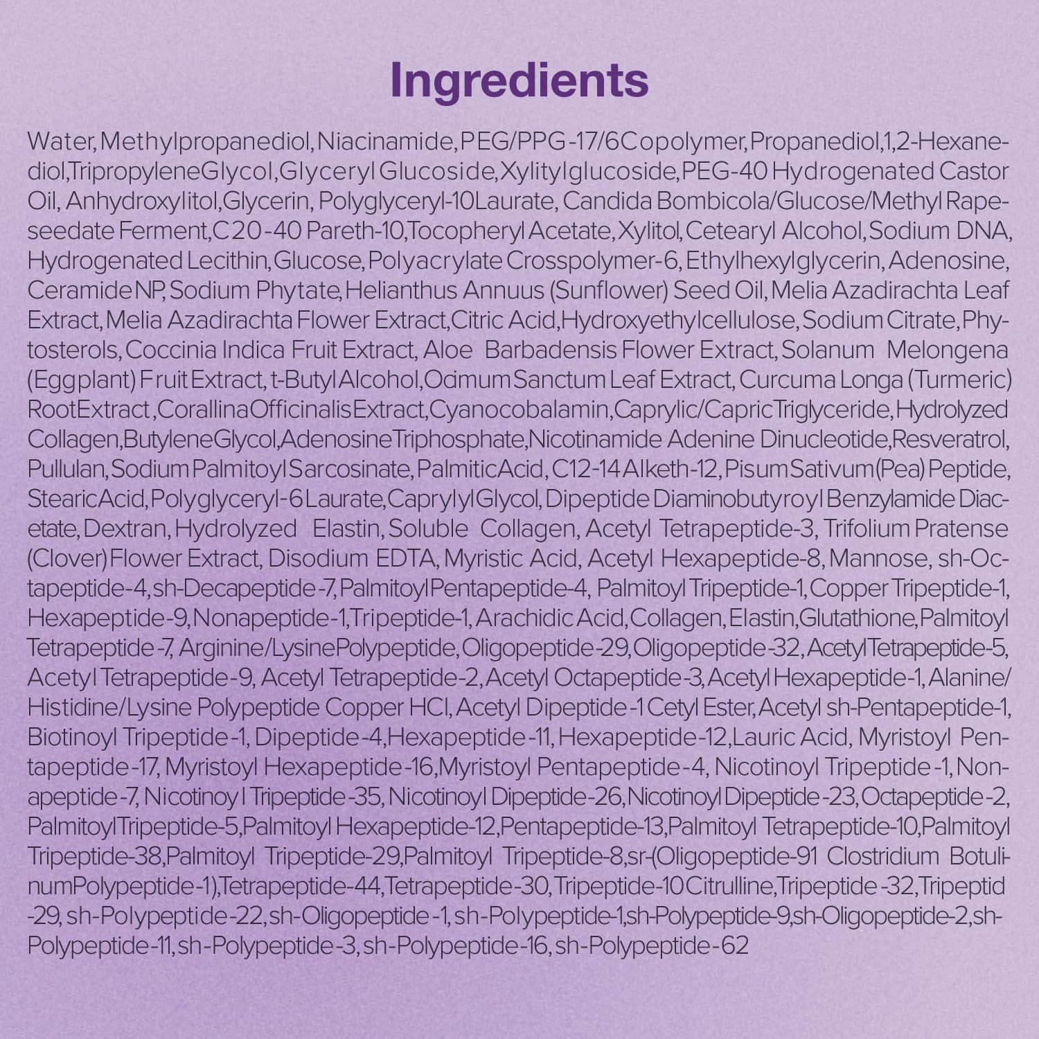 • [KEY INGREDIENTS] Formulated with 1,000ppm of 100% pure salmon PDRN to restore a natural glow and even skin tone by strengthening the skin barrier and supporting overall skin health. Powered by NAD+, an anti-aging ingredient that boosts cell turnover, stimulates collagen production, and supports repair, along with 50 peptides to visibly firm and plump the skin. *The formula’s soft violet hue comes from Vitamin B12, while its natural pearlescence is derived from ceramides.
