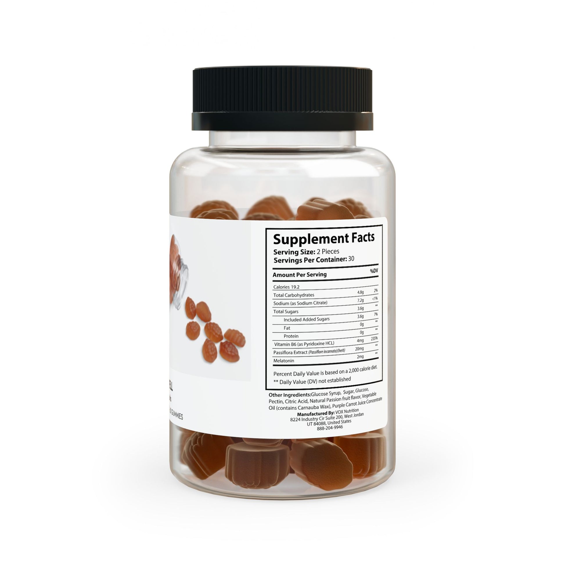 Ingredients: Sodium (as Sodium Citrate), Vitamin B6 (as Pyridoxine HCL), Passiora Extract (Passiore incarnata)(herb), Melatonin. Other Ingredients: Glucose Syrup, Sugar, Glucose, Pectin, Citric Acid, Natural Passion fruit avor, Vegetable Oil (contains Carnauba Wax), Purple Carrot Juice Concentrate