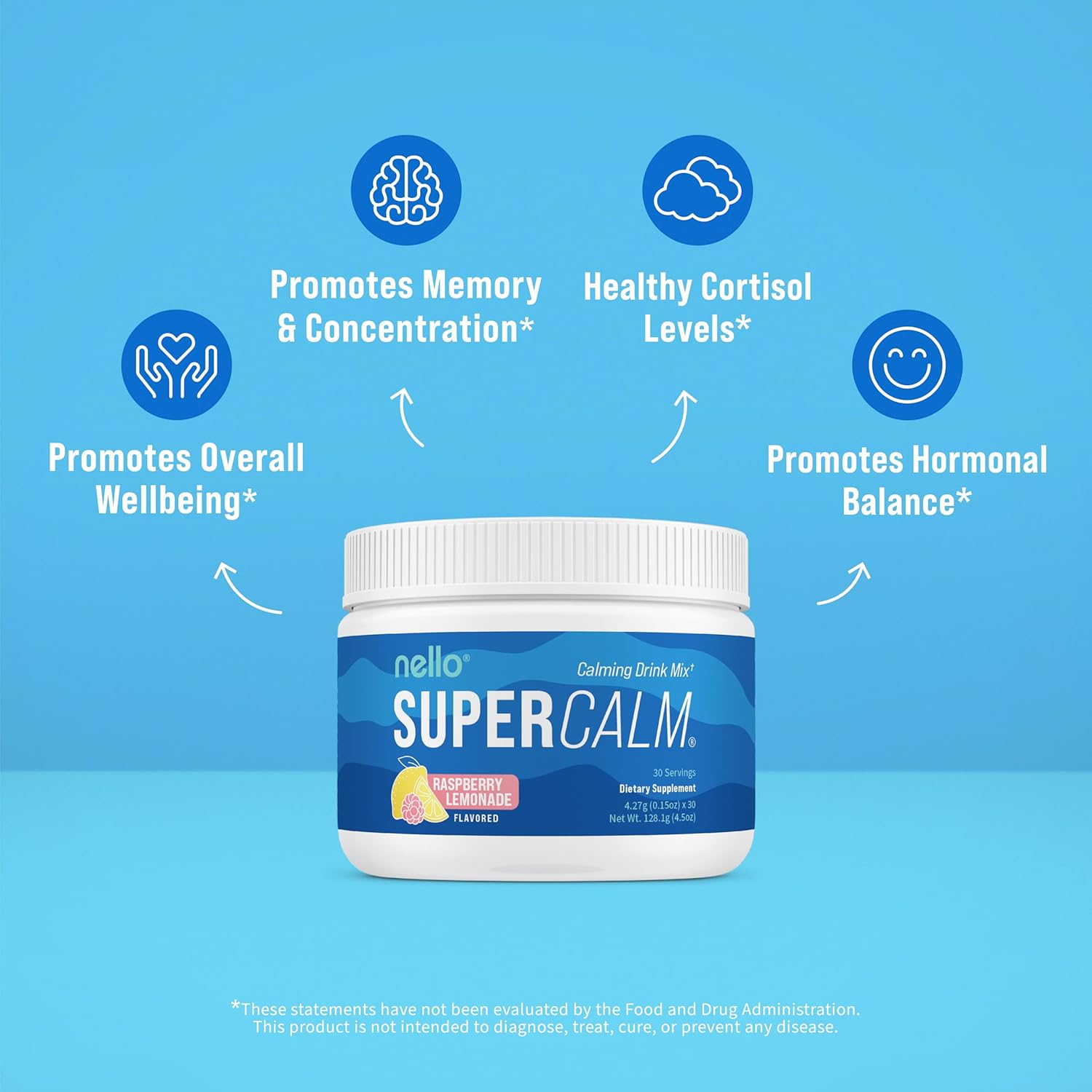 • REFRESH, RELAX, REFOCUS: Nello's Supercalm supports you in effortlessly enjoying relaxation and focus anytime, anywhere. Savor the vibrant flavors of raspberry lemonade in convenient, on the go packets or the multi-serving canister while promoting your body's vitality and equilibrium.