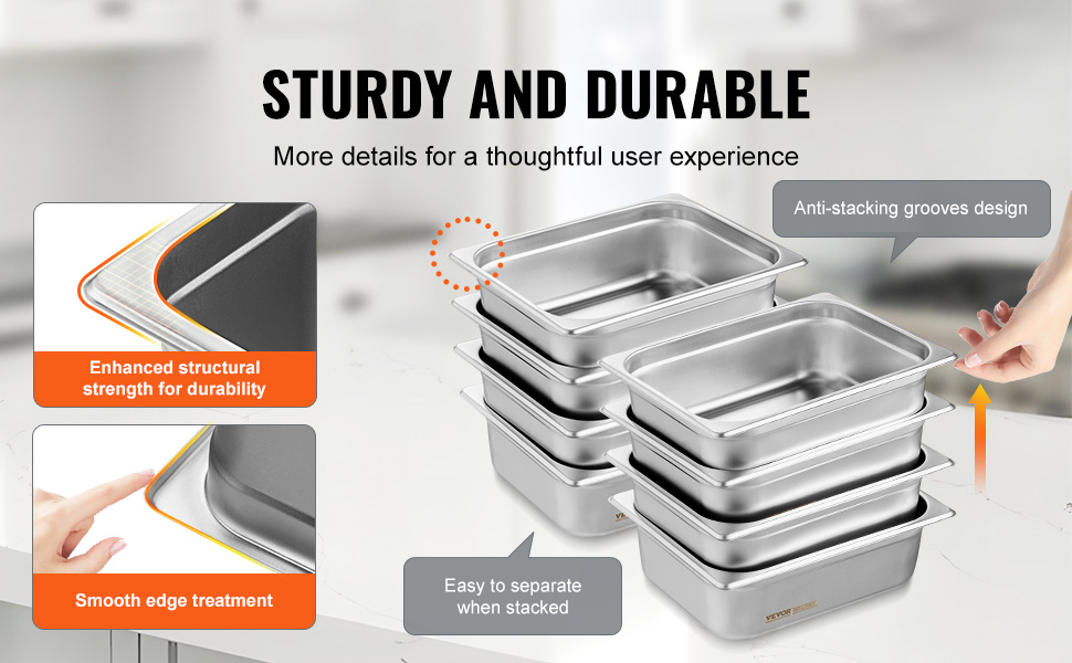 Designed with anti-stacking grooves, the stainless steel hotel pans are easy to separate when stacked and have enhanced structural strength, making them more durable.