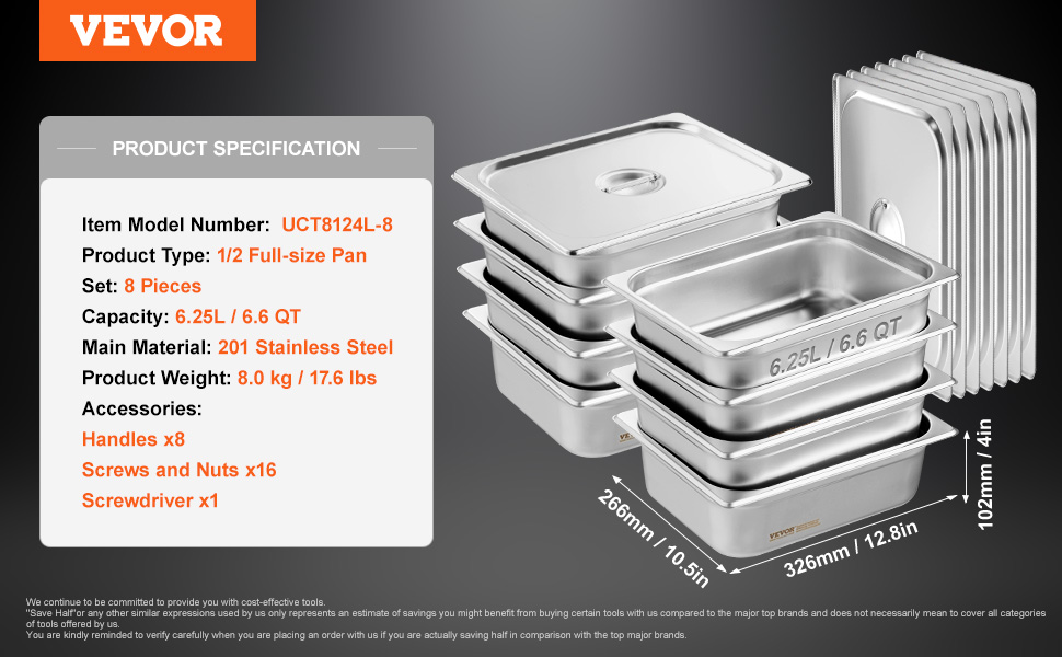 VEVOR 8 Pack Hotel Pans, 1/2 Size Anti-Jam Steam Pan with Lid, 0.8mm Thick Stainless Steel Steam Table Pan, 4-Inch Deep Commercial Table Pan, Catering Storage Food Pan, for Industrial & Scientific
