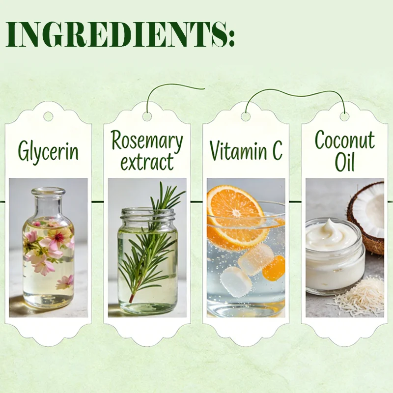 INGREDIENTS:Water, Glycerin, Rosemary extractVitamin C,Coconut Oil,Biotin,Argan Oil.
